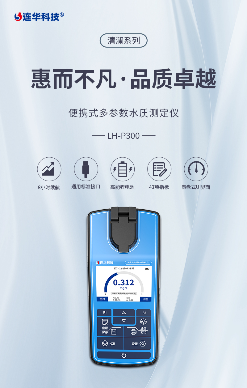簡要描述: 清瀾系列LH-P300是一款手持式多參數(shù)水質(zhì)測定儀,能夠快速、準(zhǔn)確地測量水樣中的COD、氨氮、總磷、總氮、有機污染物及無機污染物等多項參數(shù),儀器小巧輕便,操作簡單功能齊全,具有極高的性價比。經(jīng)典連華家族式動態(tài)表盤界面,量程超限紅色警示,內(nèi)置大容量鋰電池,采用Type-c標(biāo)準(zhǔn)接口,續(xù)航持久,充電、數(shù)據(jù)傳輸都非常方便。